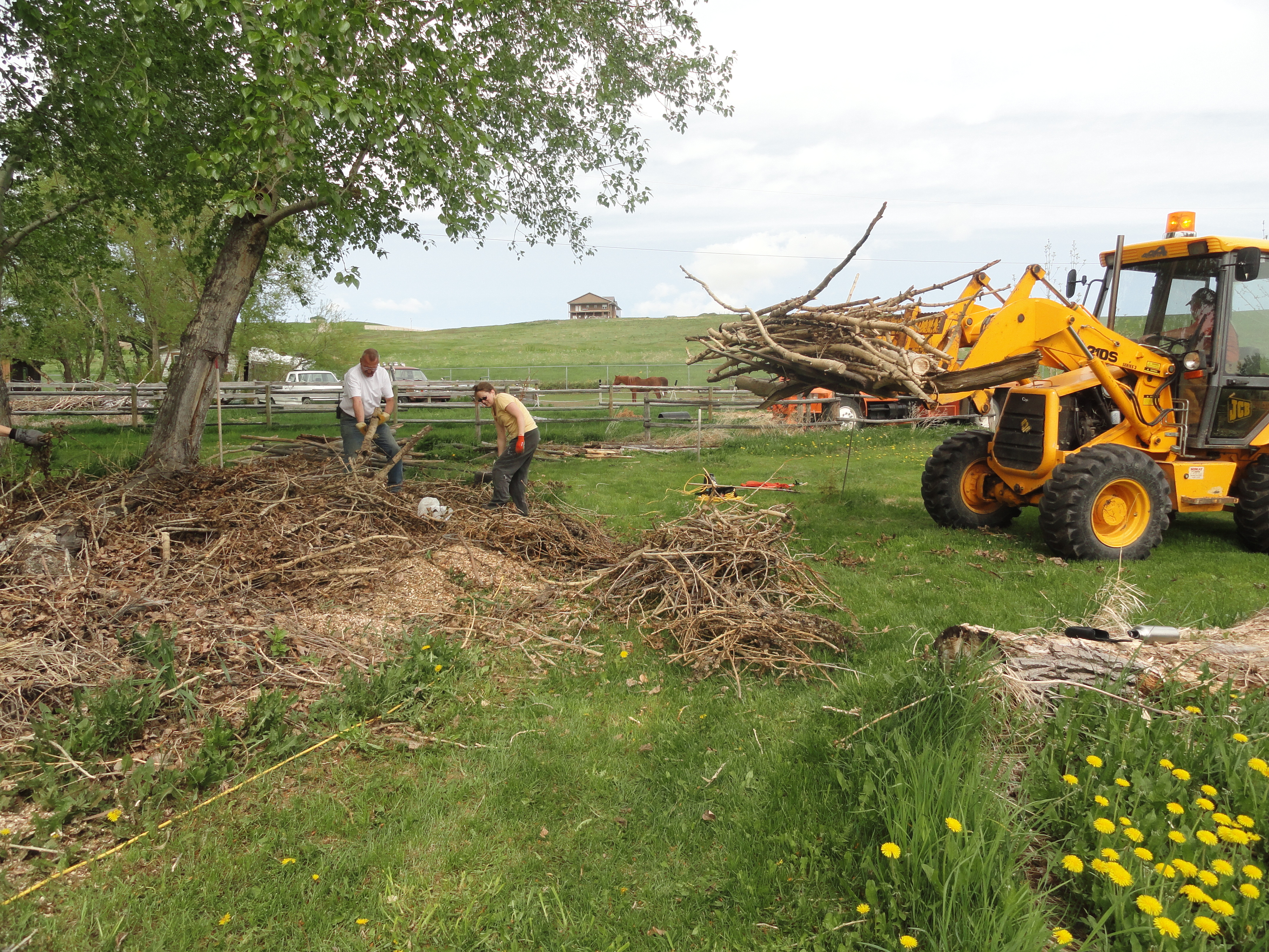 First, we had some neighbours with heavy machinery come help us get our brush pile under control. The wind tends to take a lot of branches off our mature trees over the course of the year, and the pile has built up.